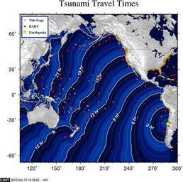 Keywords: 2010 Pichilemu earthquake - tsunami travel time map.jpg en A strong earthquake with a moment magnitude of 6 9 USGS magnitude occurred at 11 39 44 UTC 11 March 2010 day 070 and was located 85 miles/140 km SSW of Valparaiso Chile 34 259S 71 929W 6 8mi/11 0km depth--USGS location This earthquake produced a tsunami that was recorded at tide gages monitored at the Tsunami Warning Centers Many observatories provide data to the centers; such as the NOAA National Ocean Service the U of Hawaii Sea Level Center the Chilean Navy and the National Tidal Facility in Australia among others Click on the site name to see a graph of the tsunami when available Listed wave heights are maximum amplitude in cm above sea level Observed Arrival time is the actual tsunami arrival time in UTC on gages where it could be determined The Computed Arrival time is the estimated time of arrival computed at the National Tsunami Warning Center NTWC based on the origin time and location The Sample Interval column shows the time between samples 2010-03-11 http //wcatwc arh noaa gov/previous events/3-11-10-Chile/Tsunami-03-11-10 htm NOAA PD-USGov Uploaded with UploadWizard 2010 Pichilemu earthquake Files uploaded by Diego Grez-CaƱete |