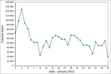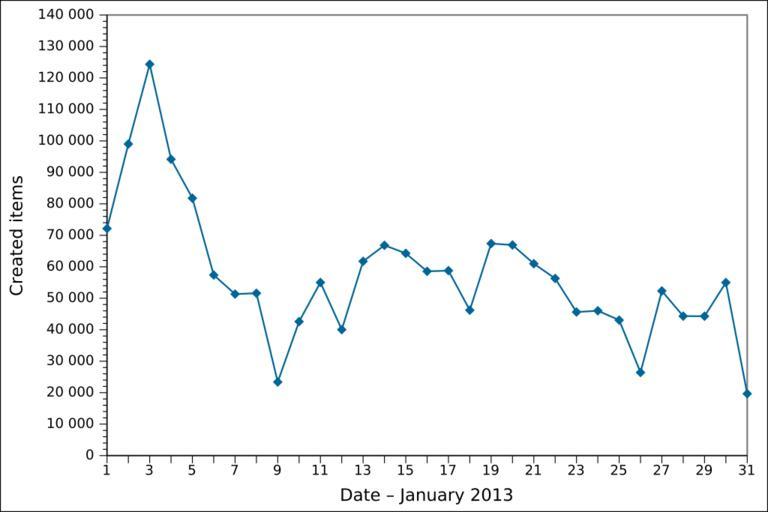 Keywords: 2013-01 Wikidata item creation EN.svg de Grafische Darstellung des täglichen Anzahls der in Januar 2013 angelegten Gegenstände auf Wikidata auf Englisch Löschungen werden nicht berücksichtigt en Graph presenting the number of items created daily on Wikidata in January 2013 in English Item deletions are not taken into account fr Graphique en anglais représentant le nombre d'éléments créés par jour sur Wikidata en janvier 2013 Les suppressions d'éléments ne sont pas prises en compte 2013-02-01 16 45 00 own Ljubinka cc-zero de inline yes File 2013-01 Wikidata item creation DE svg fr inline yes File 2013-01 Wikidata item creation FR svg Wikidata statistics in January 2013 Wikidata statistics in English |