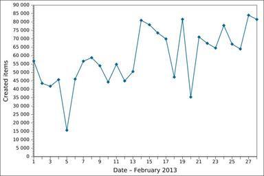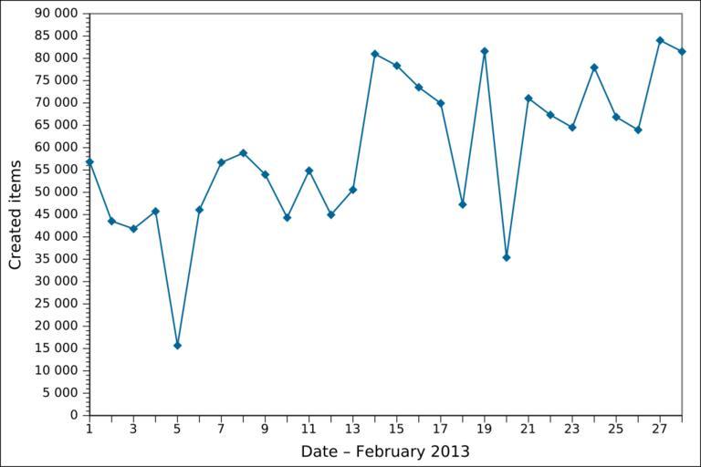 Keywords: 2013-02 Wikidata item creation EN.svg de Grafische Darstellung des täglichen Anzahls der in Februar 2013 angelegten Gegenstände auf Wikidata auf Englisch Löschungen werden nicht berücksichtigt en Graph presenting the number of items created daily on Wikidata in February 2013 in English Item deletions are not taken into account fr Graphique en anglais représentant le nombre d'éléments créés par jour sur Wikidata en février 2013 Les suppressions d'éléments ne sont pas prises en compte 2013-03-01 16 08 own Ljubinka cc-zero File 2013-02 Wikidata item creation DE svg File 2013-02 Wikidata item creation FR svg Wikidata statistics in February 2013 Wikidata statistics in English |