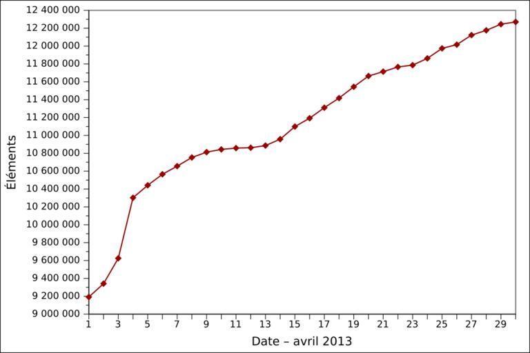 Keywords: 2013-04 Wikidata items FR.svg de Grafische Darstellung des vollständigen Anzahls der angelegten Gegenstände auf Wikidata in April 2013 auf Französisch Löschungen werden nicht berücksichtigt en Graph presenting the total number of items created on Wikidata as of April 2013 in French Item deletions are not taken into account fr Graphique en français représentant le nombre total d'éléments créés sur Wikidata en avril 2013 Les suppressions d'éléments ne sont pas prises en compte 2013-05-04 13 44 own Ljubinka cc-zero File 2013-04 Wikidata items DE svg File 2013-04 Wikidata items EN svg Wikidata statistics in April 2013 Wikidata statistics in French