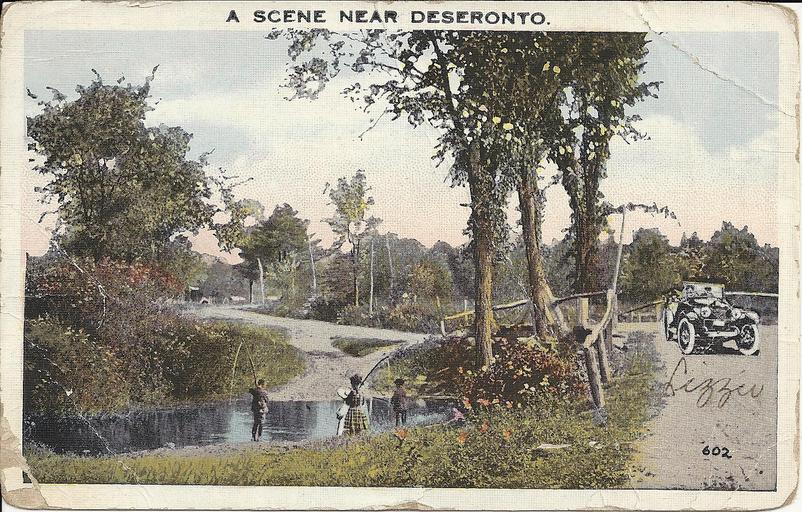 Keywords: 1920s cars trees roads outdoor photo border Coloured postcard depicting "a scene near Deseronto", Ontario. Four people are fishing next to a bridge on which there is a car. The name "Lizzie" has been written underneath the car. Reverse of this postcard. Coloured postcard depicting "a scene near Deseronto", Ontario. Four people are fishing next to a bridge on which there is a car. The name "Lizzie" has been written underneath the car. Reverse of this postcard. |