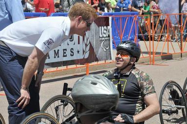 | Keywords: 2013 Warrior Games 130512-D-SC123-008.jpg en Prince Harry offers words of encouragement and jokes around with Army Lt Col Danny Dudek before the start of the 2013 Warrior Games recumbent bike cycling competition near the U S Air Force Academy in Colorado Springs Colo May 11 Jimenez went on to earn the gold medal for the event From May 11-16 more than 200 wounded ill and injured servicemembers and veterans from the U S Marines Army Air Force and Navy as well as a team representing U S Special Operations Command and an international team representing the United Kingdom will compete for the gold in track and field shooting swimming cycling archery wheelchair basketball and sitting volleyball at the U S Olympic Training Center and U S Air Force Academy The military service with the most medals will win the Chairman's Cup 2013-05-11 Shannon Collins https //www dvidshub net/image/931298 130512-D-SC123-008 2013-05-14 14 22 COLORADO SPRINGS CO US PD-USGov Prince Harry of Wales in 2013 U S Olympic Training Center Images from DoD uploaded by Fæ |