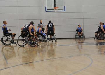 | Keywords: 2013 Warrior Games Wheelchair Basketball 130414-N-DT940-550.jpg en Team Navy/Coast Guard members strategically position themselves in a game of wheelchair basketball against Team Air Force during the 2013 Warrior Games May 14 The Warrior Games includes competitions in archery cycling seated volleyball shooting swimming track and field and wheelchair basketball The goal of the Warrior Games is not necessarily to identify the most skilled athletes but rather to demonstrate the incredible potential of wounded warriors through competitive sports More than 200 wounded ill or injured service members from the U S and U K armed forces are scheduled to compete in the Paralympics-style competition May 11-16 U S Navy photo by Mass Communication Specialist 1st Class Erica R Gardner/Released 2013-05-14 Petty Officer 1st Class Erica R Gardner https //www dvidshub net/image/932386 130414-N-DT940-550 2013-05-15 13 53 COLORADO SPRINGS CO US PD-USGov-Military-Navy 2013 Warrior Games Images from DoD uploaded by Fæ |