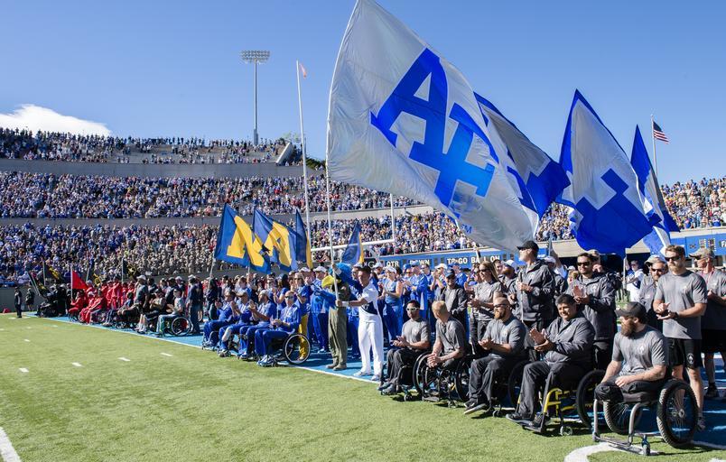 Keywords: 2014 Warrior Games 141004-D-HU462-449.jpg en U S service members and veteran athletes are recognized for achievements during the 2014 Warrior Games at halftime during the Air Force versus Navy football game at the U S Air Force Academy's Falcon Stadium in Colorado Springs Colo Oct 4 2014 The Warrior Games is an annual event allowing wounded ill and injured service members and veterans to compete in Paralympic sports including archery cycling shooting sitting volleyball track and field swimming and wheelchair basketball DOD photo by Staff Sgt Sean K Harp U S Army/Released 2014-10-04 Staff Sgt Sean Harp https //www dvidshub net/image/1604809 141004-D-HU462-449 2014-10-08 00 00 COLORADO SPRINGS CO US PD-USGov Falcon Stadium Images from DoD uploaded by Fæ |