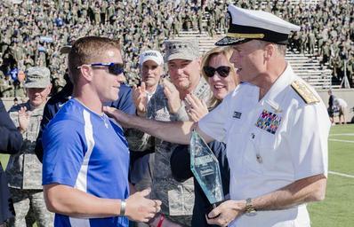 Keywords: 2014 Warrior Games 141004-D-HU462-462.jpg en Vice Chairman of the Joint Chiefs of Staff U S Navy Adm James A Winnefeld Jr presents Warrior Games Ultimate Champion Air Force veteran Mitchell Keiffer with a trophy during halftime at the Air Force versus Navy football game at the U S Air Force Academy's Falcon Stadium in Colorado Springs Colo Oct 4 2014 The Warrior Games is an annual event allowing wounded ill and injured service members and veterans to compete in Paralympic sports including archery cycling shooting sitting volleyball track and field swimming and wheelchair basketball DOD photo by Staff Sgt Sean K Harp U S Army/Released 2014-10-04 Staff Sgt Sean Harp https //www dvidshub net/image/1604839 141004-D-HU462-462 2014-10-08 00 01 COLORADO SPRINGS CO US PD-USGov James A Winnefeld Jr Falcon Stadium Images from DoD uploaded by Fæ |