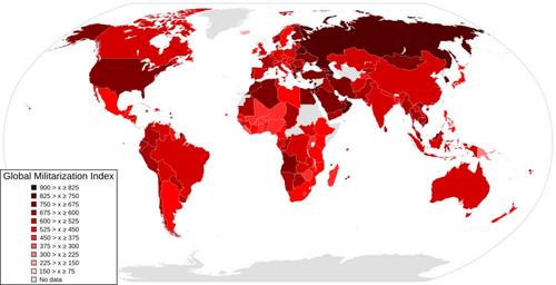 | Keywords: 2014 world map of countries by Global Militarization Index.svg Editor's note This map is saved in human-editable plain text format to make updating easier for everyone Save and open with Notepad and simply cut and paste the country code from one class to another when updating then save and upload with a new file name for that year Robinson projection SVG map of world countries shaded by their Global Militarization Index for the year 2014; a measure of the weight and importance of a country's military to the society http //gmi bicc de/index php page ranking-table year 2014 BICC 2014 2015-12-04 Jolly Janner <gallery> File 2014 world map of countries by Global Militarization Index svg Global Militarization Index File 2014 world map of countries by Military Expenditure Index svg Military Expenditure Index File 2014 world map of countries by Military Personnel Index svg Military Personnel Index File 2014 world map of countries by Heavy Weapons Index svg Heavy Weapons Index </gallery> Militarization index maps of the world |