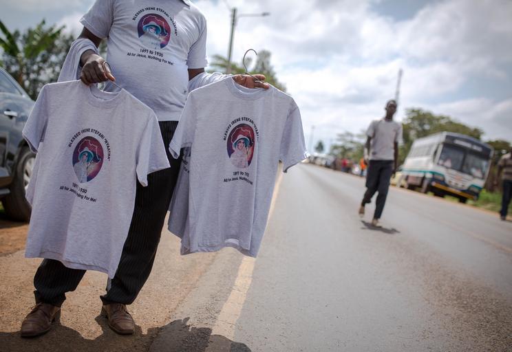 | Keywords: kenya nyeri africa roman catholic italy nun sister irene stefani nyaatha mathari gikoni sainthood missionary world war one beatification ceremony soldiers wounded tourism christian nuns faith religion outdoor KENYA, Nyeri: In a photograph taken 23 May 2015, and made available by Make It Kenya, a street trader sells t-shirts of Sister Irene Stefani, an Italian nun and missionary who is beloved in Nyeri and its environs for her selfless service to wounded World War One soldiers and ailing locals alike. Thousands of Catholic faithful, clery, government officials, residents and visitors gathered in the Kenyan town of Nyeri today, 23 May, to witness Africa’s first beatification ceremony for Sister Stefani, who was known as Aurelia Jacoba Mercede until she joined the Consolata Missionary Sisters and changed her name in 1911. She arrived in Nyeri in 1915 and gained fame over the years for her genorosity and extraordinary empathy for the sick, wounded and aged. She died in 1930 at the age of 39, after contracting plague from infected patients that she insisted on treating. Catholic authorities say that reports of her kindness and a miracle attributed to her intercession, moved Pope Francis to approve preparations for her beatification in 2014. MANDATORY CREDIT: MAKE IT KENYA PHOTO / STUART PRICE. KENYA, Nyeri: In a photograph taken 23 May 2015, and made available by Make It Kenya, a street trader sells t-shirts of Sister Irene Stefani, an Italian nun and missionary who is beloved in Nyeri and its environs for her selfless service to wounded World War One soldiers and ailing locals alike. Thousands of Catholic faithful, clery, government officials, residents and visitors gathered in the Kenyan town of Nyeri today, 23 May, to witness Africa’s first beatification ceremony for Sister Stefani, who was known as Aurelia Jacoba Mercede until she joined the Consolata Missionary Sisters and changed her name in 1911. She arrived in Nyeri in 1915 and gained fame over the years for her genorosity and extraordinary empathy for the sick, wounded and aged. She died in 1930 at the age of 39, after contracting plague from infected patients that she insisted on treating. Catholic authorities say that reports of her kindness and a miracle attributed to her intercession, moved Pope Francis to approve preparations for her beatification in 2014. MANDATORY CREDIT: MAKE IT KENYA PHOTO / STUART PRICE. |