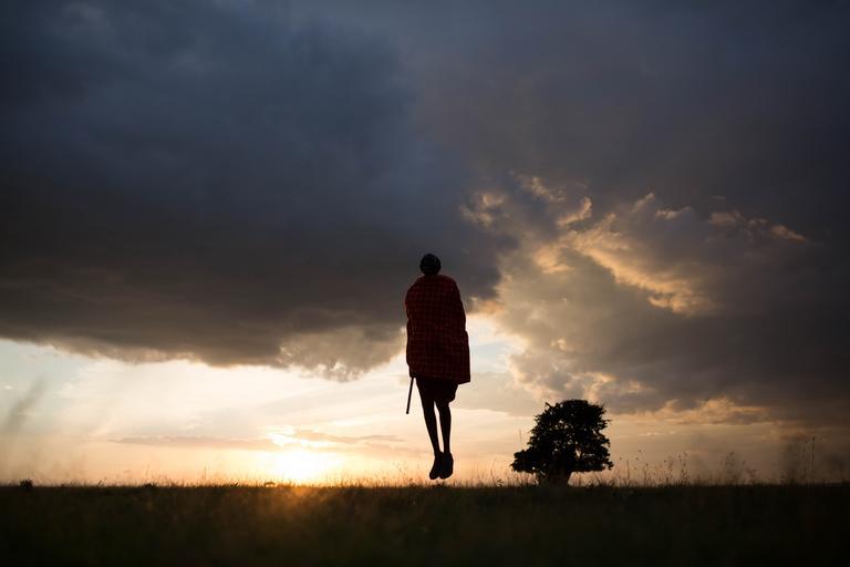 Keywords: kenya travel tourism culture tradition maasai mara national reserve north conservancy wildlife conservation walking village manyatta traditional contemporary lifestyles modern world 21st century change development outdoor sky cloud dusk sunset KENYA, Maasai Mara: In a photograph taken by Make It Kenya 23 June 2015, Josphat Mako, Maasai guide and companion to author and travel writer Stuart Butler sings traditional songs while jumping as the sun begins to set over the Mara North Conservancy adjacent to Kenya's world famous Maasai Mara National Reserve. Throughout the months of May and June, Stuart and Mako walked over 200km across traditional lands belonging to Kenya's Maasai. Embarking from the high, remote and forested Loita Hills they headed west, skirting the edge of the world famous Maasai Mara National Reserve, passing through private and community conservancies before finishing at the foot of the Oloololo Escarpment. During the expedition, Stuart and Mako visited numerous Maasai villages known as manyattas spending time with both past and present generations of Maasai people, learning about their traditional cultures and contemporary Maasai lifestyles, and the pressure of the modern world and the 21st Century, conservation, political pressures and tourism, all of which influence and contribute to Maasai life today. MANDATORY CREDIT: MAKE IT KENYA PHOTO / STUART PRICE. KENYA, Maasai Mara: In a photograph taken by Make It Kenya 23 June 2015, Josphat Mako, Maasai guide and companion to author and travel writer Stuart Butler sings traditional songs while jumping as the sun begins to set over the Mara North Conservancy adjacent to Kenya's world famous Maasai Mara National Reserve. Throughout the months of May and June, Stuart and Mako walked over 200km across traditional lands belonging to Kenya's Maasai. Embarking from the high, remote and forested Loita Hills they headed west, skirting the edge of the world famous Maasai Mara National Reserve, passing through private and community conservancies before finishing at the foot of the Oloololo Escarpment. During the expedition, Stuart and Mako visited numerous Maasai villages known as manyattas spending time with both past and present generations of Maasai people, learning about their traditional cultures and contemporary Maasai lifestyles, and the pressure of the modern world and the 21st Century, conservation, political pressures and tourism, all of which influence and contribute to Maasai life today. MANDATORY CREDIT: MAKE IT KENYA PHOTO / STUART PRICE.