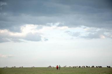Keywords: kenya travel tourism culture tradition maasai mara national reserve north conservancy wildlife conservation walking village manyatta traditional contemporary lifestyles modern world 21st century change development outdoor sky cloud KENYA, Maasai Mara: In a photograph taken by Make It Kenya 23 June 2015, author and travel writer Stuart Butler and his Maasai guide and companion Josphat Mako walk past zebra and wildebeest as they cross the Mara North Conservancy adjacent to Kenya's world famous Maasai Mara National Reserve. Throughout the months of May and June, Stuart and Mako walked over 200km across traditional lands belonging to Kenya's Maasai. Embarking from the high, remote and forested Loita Hills they headed west, skirting the edge of the world famous Maasai Mara National Reserve, passing through private and community conservancies before finishing at the foot of the Oloololo Escarpment. During the expedition, Stuart and Mako visited numerous Maasai villages known as manyattas spending time with both past and present generations of Maasai people, learning about their traditional cultures and contemporary Maasai lifestyles, and the pressure of the modern world and the 21st Century, conservation, political pressures and tourism, all of which influence and contribute to Maasai life today. MANDATORY CREDIT: MAKE IT KENYA PHOTO / STUART PRICE. KENYA, Maasai Mara: In a photograph taken by Make It Kenya 23 June 2015, author and travel writer Stuart Butler and his Maasai guide and companion Josphat Mako walk past zebra and wildebeest as they cross the Mara North Conservancy adjacent to Kenya's world famous Maasai Mara National Reserve. Throughout the months of May and June, Stuart and Mako walked over 200km across traditional lands belonging to Kenya's Maasai. Embarking from the high, remote and forested Loita Hills they headed west, skirting the edge of the world famous Maasai Mara National Reserve, passing through private and community conservancies before finishing at the foot of the Oloololo Escarpment. During the expedition, Stuart and Mako visited numerous Maasai villages known as manyattas spending time with both past and present generations of Maasai people, learning about their traditional cultures and contemporary Maasai lifestyles, and the pressure of the modern world and the 21st Century, conservation, political pressures and tourism, all of which influence and contribute to Maasai life today. MANDATORY CREDIT: MAKE IT KENYA PHOTO / STUART PRICE.