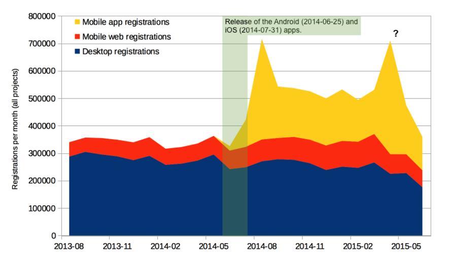 Keywords: 2015-06 Wikimedia account registrations by platform.png en A graph of monthly Wikimedia account registrations broken down by registration platform desktop mobile web or mobile app 2015-07-16 own Neil P Quinn-WMF other versions cc-zero Uploaded with UploadWizard Uncategorized 2015 September 11 |