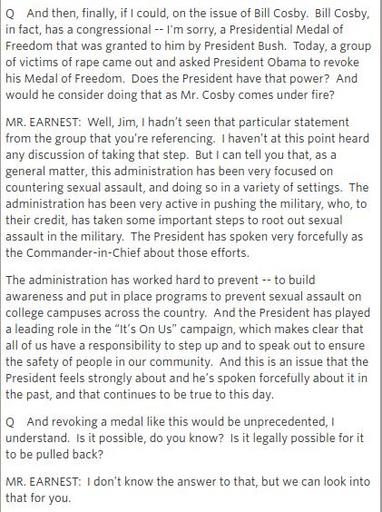 | Keywords: 2015-07-08 White House Press Secretary on Revoking Medal of Freedom from Bill Cosby.jpg Q And then finally if I could on the issue of Bill Cosby Bill Cosby in fact has a congressional -- I'm sorry a Presidential Medal of Freedom that was granted to him by President Bush Today a group of victims of rape came out and asked President Obama to revoke his Medal of Freedom Does the President have that power And would he consider doing that as Mr Cosby comes under fire MR EARNEST Well Jim I hadn ™t seen that particular statement from the group that you ™re referencing I haven ™t at this point heard any discussion of taking that step But I can tell you that as a general matter this administration has been very focused on countering sexual assault and doing so in a variety of settings The administration has been very active in pushing the military who to their credit has taken some important steps to root out sexual assault in the military The President has spoken very forcefully as the Commander-in-Chief about those efforts The administration has worked hard to prevent -- to build awareness and put in place programs to prevent sexual assault on college campuses across the country And the President has played a leading role in the It ™s On Us campaign which makes clear that all of us have a responsibility to step up and to speak out to ensure the safety of people in our community And this is an issue that the President feels strongly about and he ™s spoken forcefully about it in the past and that continues to be true to this day Q And revoking a medal like this would be unprecedented I understand Is it possible do you know Is it legally possible for it to be pulled back MR EARNEST I don ™t know the answer to that but we can look into that for you Q Follow-up question please Josh MR EARNEST I ™ll come back to you April Q Josh I want to go back to what Jim asked With your answer it seems this administration is well aware of the news reports about Bill Cosby this iconic man who now -- information has been released that he indeed gave Quaaludes to women What is the President saying about this particularly as he is someone who has promoted women and girls And as you said he has fought against issues of sexual assault in the military and on college campuses What is he personally saying about this as Bill Cosby is an iconic person throughout the years and globally not just in the United States MR EARNEST I believe the last time the President talked about this was he was asked about it in an interview with Univision back in December So you can take a look at the President ™s comments at that point I haven ™t spoken to him since these latest revelations that were reported publicly in the last couple of days Q But with this -- and going back to Jim ™s question -- is it out of the realm of possibility Because of this -- and again the times that we're in the fact that there is a push for women and girls in this administration and the fact that you are countering sexual assaults -- with somebody like this this could be a very big statement Would the administration consider revoking his medal from the White House from the Bush administration MR EARNEST Well as I mentioned to Jim I don't know whether or not it ™s legally possible to do so But -- Q Can you investigate the possibility because again of what I asked MR EARNEST Well I ™ll see if we can get an answer to the question that you ™ve asked https //www whitehouse gov/the-press-office/2015/07/08/press-briefing-press-secretary-josh-earnest-7815 www whitehouse gov 2015-07-08 The White House Public Domain Revoke the Presidential Medal of Freedom from Bill Cosby PD-USGov Bill Cosby in 2015 Bill Cosby-related documents Bill Cosby sexual assault allegations Revoke the Presidential Medal of Freedom from Bill Cosby |