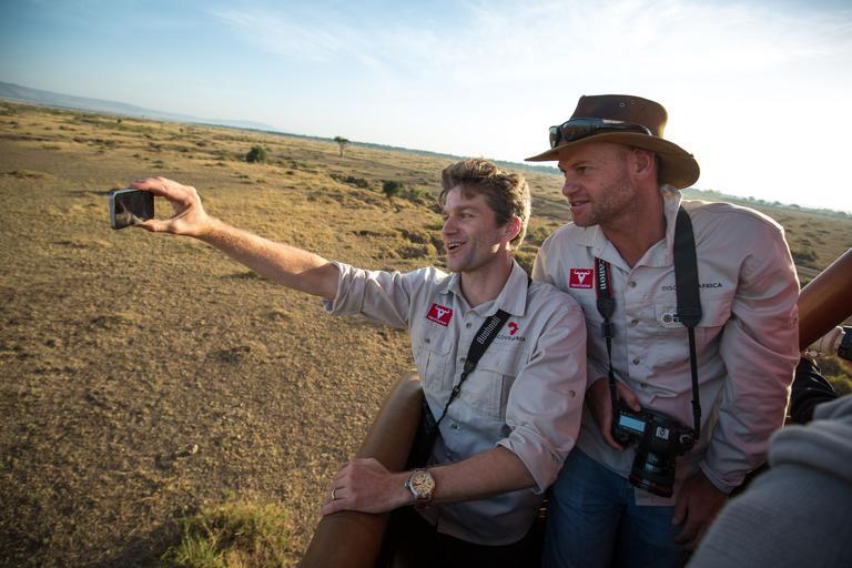 Keywords: KENYA, Masai Mara: In a photograph taken by Make It Kenya 02 October 2015, Andre Van Kets (left) and Carel Verheof, Co-founders of the website discoverafrica.com/herdtracker, and resource that tracks the annual wildebeest migration in Kenya's Masai Nara National Reserve and Tanzania's Serengeti, live-streams video over the internet via the Twitter application Periscope as a Governor's Balloon Safari floats along the course of the Mara River. Seeing the Mara from the air requires an early start in order to be airborne for the sunrise, but offers tourists visiting the famous wildlife reserve a unique and panoramic way to view one of Kenya's most famous natural attractions from the basket of a hot air balloon. MANDATORY CREDIT: MAKE IT KENYA PHOTO / STUART PRICE. KENYA, Masai Mara: In a photograph taken by Make It Kenya 02 October 2015, Andre Van Kets (left) and Carel Verheof, Co-founders of the website discoverafrica.com/herdtracker, and resource that tracks the annual wildebeest migration in Kenya's Masai Nara National Reserve and Tanzania's Serengeti, live-streams video over the internet via the Twitter application Periscope as a Governor's Balloon Safari floats along the course of the Mara River. Seeing the Mara from the air requires an early start in order to be airborne for the sunrise, but offers tourists visiting the famous wildlife reserve a unique and panoramic way to view one of Kenya's most famous natural attractions from the basket of a hot air balloon. MANDATORY CREDIT: MAKE IT KENYA PHOTO / STUART PRICE.