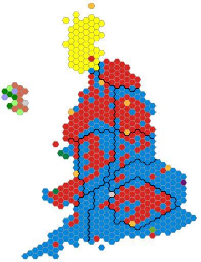 Keywords: 2015 UK general election constituency map.svg Legend 0087dc Conservative dc241f Labour fdbb30 Liberal Democrats 6ab023 Green Party ffff00 Scottish National Party 008142 Plaid Cymru d46a4c Democratic Unionist Party 99ff66 Social Democratic and Labour Party 008800 Sinn Féin 9999ff Ulster Unionist Party FFCC01 Alliance Party Northern Ireland 70147a UK Independence Party cccccc Independent FFFFFF Undeclared/Delayed Regional boundaries 2px solid 000000 2015 UK General Election showing constituencies as equal area hexagons and approximate geographic location Self made based upon previous version 2015-05-08 Ch1902 Parliament of the United Kingdom 2015 UK General election |