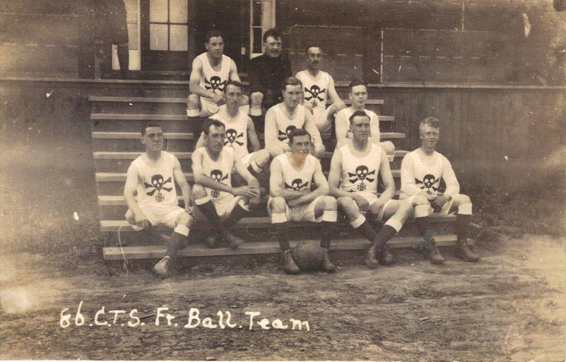 Keywords: world war i worldwari 1910s "86 C.T.S. [Canadian Training Squadron] Ft. Ball Team" Eleven men wearing shorts and white vests with black skull-and-crossbones motifs, sitting on steps. "86 C.T.S. [Canadian Training Squadron] Ft. Ball Team" Eleven men wearing shorts and white vests with black skull-and-crossbones motifs, sitting on steps. |