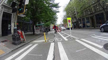 Keywords: seattle bicycle sidepath cycletrack separated segregated lane path road sidewalk outdoor intersection vehicle bike
