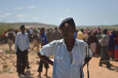 Keywords: outdoor A member of the Somali Police Force watches over a crowd as food aid is distributed to people affected by the recent flooding in Beletweyne, Somalia, on May 29, 2016. Flooding in the Hiraan region of Somalia has led to the displacement of 17,000 people so far and is the worst to hit the region since 1981. AMISOM Photo / Tobin Jones A member of the Somali Police Force watches over a crowd as food aid is distributed to people affected by the recent flooding in Beletweyne, Somalia, on May 29, 2016. Flooding in the Hiraan region of Somalia has led to the displacement of 17,000 people so far and is the worst to hit the region since 1981. AMISOM Photo / Tobin Jones |