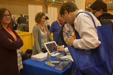Keywords: ams2016 goes-r goesr jpss ncei nesdis noaa noaa satellite and information service noaasatelliteandinformationservice noaa satellites noaasatellites education outreach events education and outreach educationandoutreach indoor A WeatherFest participant tries out the GOES-R mobile game "Satellite Insight" at the 2016 AMS WeatherFest. Download "Satellite Insight" from the iTunes store and Google Play! On January 11, the annual AMS WeatherFest was held prior to the start of the 96th Annual Meeting. Open to weather enthusiasts of all ages, this annual weather fair is one of the most popular events at the AMS Annual Meeting. Parents, teachers, kids, youth groups, and others spent the afternoon learning about the weather and participating in fun activities. The NOAA Satellite and Information Service had a booth at the event, staffed by GOES-R, JPSS and NCEI personnel. At the booth, participants could spin the “Wheel of Science” for a chance to answer questions about weather and win prizes. Also available were iPads allowing attendees to experience the GOES-R mobile game “Satellite Insight” and the SARSAT Program’s “Rescue 406.” Original photo source: www.goes-r.gov/multimedia/events.html A WeatherFest participant tries out the GOES-R mobile game "Satellite Insight" at the 2016 AMS WeatherFest. Download "Satellite Insight" from the iTunes store and Google Play! On January 11, the annual AMS WeatherFest was held prior to the start of the 96th Annual Meeting. Open to weather enthusiasts of all ages, this annual weather fair is one of the most popular events at the AMS Annual Meeting. Parents, teachers, kids, youth groups, and others spent the afternoon learning about the weather and participating in fun activities. The NOAA Satellite and Information Service had a booth at the event, staffed by GOES-R, JPSS and NCEI personnel. At the booth, participants could spin the “Wheel of Science” for a chance to answer questions about weather and win prizes. Also available were iPads allowing attendees to experience the GOES-R mobile game “Satellite Insight” and the SARSAT Program’s “Rescue 406.” Original photo source: www.goes-r.gov/multimedia/events.html |