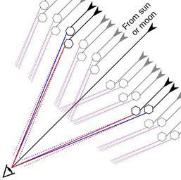 Keywords: 22 degree halo Observer looking at 22 degree halo.svg en Footer The observe only sees light coming from a specific group of crystals that are at an angle of about 22° relative to the line of sight towards the sun or moon No angles in this image have been exaggerated In this illustration the hexagons represent a cloud of ice crystals Only a specific group of them direct light of any significant intensity toward a given observer The dotted lines in the illustration represent light that is not entering the eye of the observer while the two solid red and two solid blue lines represent the light at the two extreme edges of the spectrum that do enter the observer ™s eye <br> The group of ice crystals directing light into the observer ™s eye while appearing circular from the point of view of the observer in fact have a three dimensional cone shape stretching into the cloud of crystals This group of crystals can be further divided into smaller groups depending on the color of the light they direct into the observer ™s eye The cone of crystals directing blue light toward a given observer has a slightly larger internal angle than the cone directing red light this is because blue light is bent more by a given ice crystal Created with Inkscape Free open source own Dave3457 2011-02-10 22 degree halo Observer looking at 22 degree halo_fr svg 50 22°-Halo Halo diagrams |