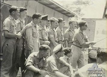 Keywords: 22 Squadron RAAF Boston aircrews Kiriwina Nov 1943 AWM OG0365.jpg AWM caption KIRIWINA TROBRIAND ISLANDS PAPUA C 1943-11 AIRCREWS OF NO 22 BOSTON SQUADRON RAAF BEING BRIEFED FOR AN AIR ATTACK ON NEW BRITAIN <br> LEFT TO RIGHT PILOT OFFICER PO J K LEWIS FLYING OFFICER FO M J CARSE SQUADRON LEADER J HICKEY TOOWOOMBA QLD FO G CLOSE; SERGEANT SGT J AUMANN SGT G DIXON; FLIGHT SERGEANT H OLIVER FO A YOUNG FO J W CONNELL BUNBURY WA FO R WHITFORD FLIGHT SERGEANT P O'ROURKE PO M TAYLOR BACK TO CAMERA FLIGHT LIEUTENANT L WILLIAMS BRIEFING OFFICER OG0365 circa November 1943 Harrison John Thomas Copyright expired - public domain PD-AustraliaGov No 22 Squadron RAAF World War II people of the Royal Australian Air Force World War II forces of Australia in New Guinea Douglas Boston/A-20 Havoc aircrew John Thomas Harrison World War II aircrew briefing |