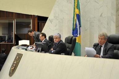 Keywords: Mesa diretora. Da direita para a esquerda, deputados Fernando Scanavaca (PDT), Valdir Rossoni (PSDB) e Ademir Bier (PMDB). Fotos: Sandro Nascimento (Alep / crédito obrigatório)