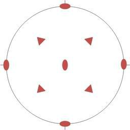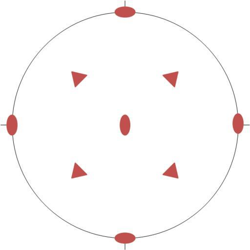 Keywords: 23 point group.png en Stereographic representation of the symmetry point group 23 The 001 direction is perpendicular to the projection plane The rotation axes are represented in red The thin black ticks show the direction of the equivalent crystallographic axes a and b fr Représentation stéréographique du groupe ponctuel de symétrie 23 La direction 001 est perpendiculaire au plan de projection Les axes de rotation sont représentés en rouge Les trait fins noirs montrent la direction des axes cristallographiques équivalents a et b own Perditax 2011-06-06 Cc-zero Point groups |