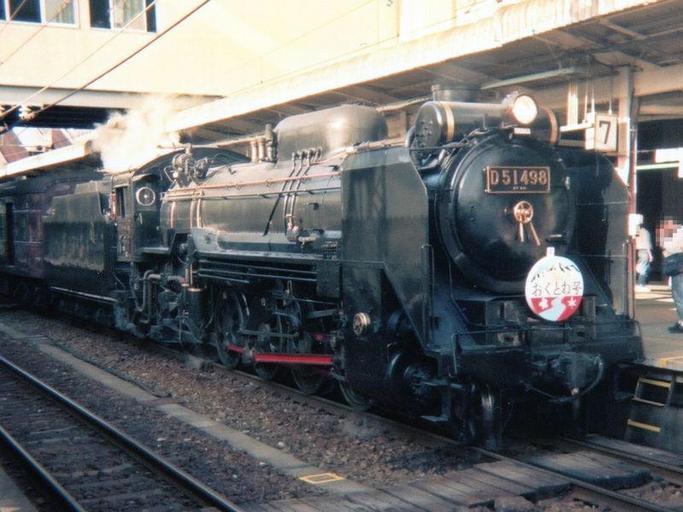 Keywords: locomotive vehicle train steam engine railroad outdoor East Japan Railway Company, Steam locomotives type D51 at Takasaki Station, 1989. East Japan Railway Company, Steam locomotives type D51 at Takasaki Station, 1989.