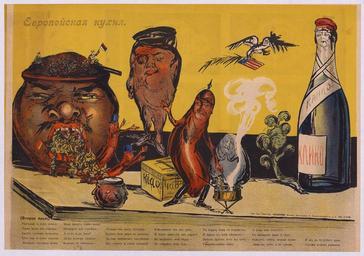 Keywords: 28-2 Sammlung Eybl Европейская кухня (Europäische Küche). 1914. 36 x 51 cm. (Slg.Nr.273).jpg Russland Alexander Apsit 1880-1943 Ев опейская кухня Europäische Küche 1914 36 x 51 cm Slg Nr 272 273 Fortsetzung des ersten Bildes Der russische Brei quillt aus dem Topf und klebt die österreichischen Würstchen am Boden fest Sie rufen die deutsche Wurst zu Hilfe doch die ist gerade damit beschäftigt die italienischen Makkaroni einzukochen und steht selbst unter Beobachtung des Champagners und des Roast Beefs Neu im Bild Der amerikanische Vogel mit dem Palmzweig des Friedensstifters Russia Alexander Apsit 1880-1943 Ев опейская кухня European kitchen 1914 36 x 51 cm Slg Nr 272 273 The Russian pulp swells out of the pot and sticks firmly the Austrian sausages on the ground Call the German sausage to help but they are just busy to cook the Italian Macaroni and is even under observation of champagne and Roast Beefs New Image The American Bird with the palm of peacemaker Sammlung Eybl Plakatmuseum Wien 2015-09-17 10 29 12 A Erhardt Credit line Eybl Plakatmuseum Wien/Wikimedia Commons CC-BY-SA-4 0 wiki Sammlung Eybl Plakatmuseum Wien PD-old World War I posters of Russia Plakatmuseum Wien Eybl Collection Quality images by Hubertl QualityImage