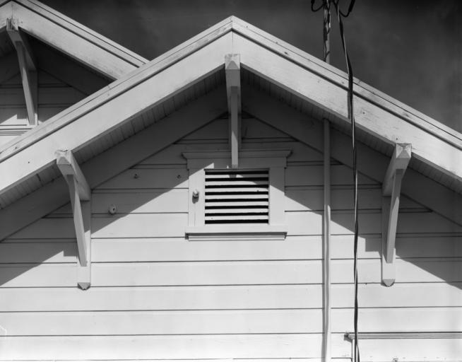 | Keywords: 2984 Misty Street - detail of eave - Chemawa Indian School - Salem Oregon.jpg brackets wood siding ” Chemawa Indian School 2984 Misty Street Salem Marion County Oregon Built 1923; demolished 1978 Former National Register of Historic Places listing 1977 photograph from the HABS ”Historic American Buildings Survey images of Oregon - ;Credits Steve Vaile photographer CALL NUMBER HABS ORE 24-SAL 1I- CREATOR Historic American Buildings Survey creator NOTE Survey number HABS OR-129-I DIGID http //hdl loc gov/loc pnp/hhh or0048 LOC card Frame with novelty siding rectangular with rear extension 26' three-bay front x 30' one story gable roof with exposed rafters and purlins forming brackets two-bay gable-roof entrance porch with square columns and baluastrade Built 1920-21; demolished 1978 4 ext photos 1977 Also see Chemwa Indian School OR-129 Card prepared 1979 Library of Congress Steve Viale 1977 OR-129-L Historic American Buildings Survey photographs of the Chemawa Indian School Brackets architecture Chemawa Sidings Chemawa Bungalows in Oregon ~ Former buildings in Oregon ~ 1977 in Oregon Chemawa Black and white photographs of Oregon Chemawa |