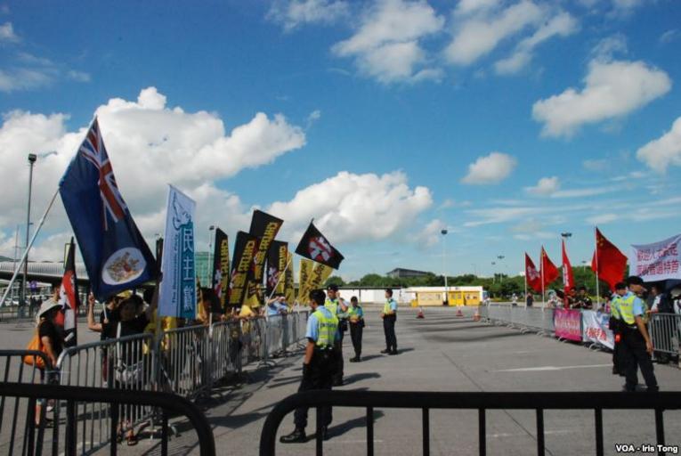 Keywords: 狙擊李飛 (2).jpg zh-tw 反對及支持中 全 人大常委 對香港特首普選決定的 派及親北京 體, 政改簡介 場外高舉港英旗,以及中 五星旗 香港特 旗 2014-09-02 08 49 55 http //www voacantonese com/media/photogallery/hong-kong-pan-democrats-protest-over-visiting-beijing-officials/2434695 html Voice of America Custom license marker 2014 09 02 PD-USGov-VOA Uploaded with UploadWizard 2014 Hong Kong electoral reform |