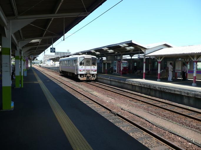 Keywords: 益田駅2番線.JPG Masuda Station platform 2 益田駅の2番線に 車中の列車 Own ペ 家音 2009-07-30 JR West Kiha 120 Masuda Station
