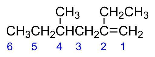 Keywords: 2-Ethyl-4-methylhex-1-ene.svg en 2-Ethyl-4-methylhex-1-ene with carbon numbering own Calvero 2009-11-25 Chemical structures to explain nomenclature