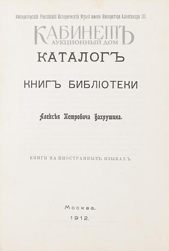 Каталог книг библиотеки Алексея Петровича Бахрушина. Выпуск I. Выпуск II. Выпуск дополнительный - Книги на иностранных языках. М., Типо-Литография Торгового Дома А.П. Коркин, 1911-1912.