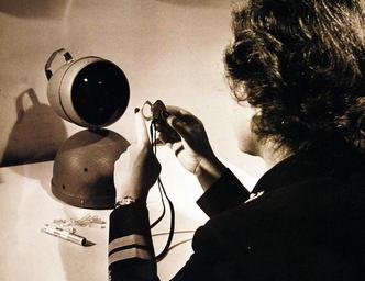 Keywords: 330-PS-1004 (USN 708062): Navy’s Two Types of Radiation Detectors. Lieutenant Rosemary Lalferty is holding one of the two types of radiation “dog tags” developed by the U.S. Navy Research Laboratory under sponsorship of the Bureau of Ships, for the protection of its personnel. The oblong object on the table is the other type. Both types of “Dosimeters,” which measure the amount of radiation exposure the wearer has experienced, are simple, rugged and inexpensive. They keep their sensitivity in storage and under extreme heat. One type uses salt crystals known as Alkali Halides, which are normally transparent but turn blue when exposed to gamma rays. A U.S. Navy medic can compare the intensity of the shade of blue of the “dog tag” with a color chart and decide on the spot the degree of seriousness of the individual radiation casualty. Silver-activated phosphate glass is the sensitive element in the other type. Gamma Rays convert the glass into phosphor which takes on an orange color under ultraviolet light. The intensity of the color is the measure of the radiation dose. A quick measure can be made visually. Accurate measurement can be made with a simple and compact photoelectric “reader.” Photograph released January 15, 1950. (6/30/2015). 330-PS-1004 (USN 708062): Navy’s Two Types of Radiation Detectors. Lieutenant Rosemary Lalferty is holding one of the two types of radiation “dog tags” developed by the U.S. Navy Research Laboratory under sponsorship of the Bureau of Ships, for the protection of its personnel. The oblong object on the table is the other type. Both types of “Dosimeters,” which measure the amount of radiation exposure the wearer has experienced, are simple, rugged and inexpensive. They keep their sensitivity in storage and under extreme heat. One type uses salt crystals known as Alkali Halides, which are normally transparent but turn blue when exposed to gamma rays. A U.S. Navy medic can compare the intensity of the shade of blue of the “dog tag” with a color chart and decide on the spot the degree of seriousness of the individual radiation casualty. Silver-activated phosphate glass is the sensitive element in the other type. Gamma Rays convert the glass into phosphor which takes on an orange color under ultraviolet light. The intensity of the color is the measure of the radiation dose. A quick measure can be made visually. Accurate measurement can be made with a simple and compact photoelectric “reader.” Photograph released January 15, 1950. (6/30/2015). |
