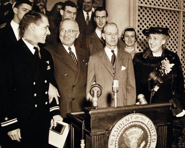 Keywords: groupshot people indoor 330-PS-1283 (USN 708201): Navy Pilot Receives Medal of Honor. President Harry S. Truman and Lieutenant Junior Grade Thomas J. Hudner, Jr., are shown after the awarding the Medal of Honor. Left to right: Lieutenant Junior Grade Thomas J. Hudner, Jr, President Truman, Thomas J. Hudner, Sr. (Father), Mrs. Thomas J. Hudner, Sr, (mother). Rear row: His brothers, Philip, Richard, and his sister Mary. For the attempted rescue of Ensign Brown, whose plane struck by anti-aircraft fire and trailing smoke, was forced down behind enemy lines in the Chosin Reservoir area of Korea on December 4, 1950. Lieutenant Junior Grade Thomas J. Hudner, Jr., USN, received the Medal of Honor from President Harry S. Truman at a ceremony at the White House. Photograph released April 13, 1951. Same as NHHC Photograph NH 97094. (6/16/2015). 330-PS-1283 (USN 708201): Navy Pilot Receives Medal of Honor. President Harry S. Truman and Lieutenant Junior Grade Thomas J. Hudner, Jr., are shown after the awarding the Medal of Honor. Left to right: Lieutenant Junior Grade Thomas J. Hudner, Jr, President Truman, Thomas J. Hudner, Sr. (Father), Mrs. Thomas J. Hudner, Sr, (mother). Rear row: His brothers, Philip, Richard, and his sister Mary. For the attempted rescue of Ensign Brown, whose plane struck by anti-aircraft fire and trailing smoke, was forced down behind enemy lines in the Chosin Reservoir area of Korea on December 4, 1950. Lieutenant Junior Grade Thomas J. Hudner, Jr., USN, received the Medal of Honor from President Harry S. Truman at a ceremony at the White House. Photograph released April 13, 1951. Same as NHHC Photograph NH 97094. (6/16/2015). |