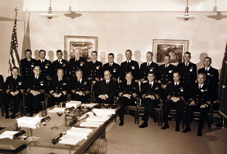 | Keywords: group performance indoor 330-PS-1290 (USN 708197): Naval Reserve Policy Board Holds Annual Meeting. Various Naval Districts and Naval Officials in Washington, D.C. met in the Pentagon on April 9, 1951, to open their annual two week meeting for the purpose of formulating plans and policies for future operations of the U.S. Naval Reserve program. The board, headed by Secretary of the Navy Francis P. Matthews, included Admiral Forrest P. Sherman, Vice Admiral Laurence T. Dubose, Chief of Naval Personnel, and Rear Admiral R.S. Riggs, Administrative Chief of Operations for the Naval Reserve. The Members of the Board: (front row, left to right): Captain F.B. Kirk, Third Naval District; Captain W.A. Neil, Fourth Naval District; Rear Admiral Rigs, Admiral Sherman, Secretary of the Navy Matthews; Vice Admiral Dubose; Captain John. H. Schultz, Assistant Chief of Naval Personnel; Commander E. H. Sutter, Sixth Naval District; and Commander John R. Hoyt, Commander of Naval Air Reserve Training Delegate. (Rear row, left to right): Commander L. M. King, Eleventh Naval District; Captain R.L. Johnson, Ninth Naval District; Commander P.G. Moltani, Bureau of Personnel (training) Delegate; Captain Edmund B. Taylor, Bureau of Personnel Delegate; Commander G.E. Glassock, Fifth Naval District; Captain Neal P. Pendleton, Eighth Naval District; Commander C.G. Pell, Fourteenth Naval District; Commander Jim K. Carpenter, Thirteenth Naval District; Captain Albert Berry, Twelfth Naval District; Lieutenant Commander A.A. Libbey, First Naval District, and Lieutenant Commander H.P. Ruben, Recorder. Photograph released April 11, 1951. (6/16/2015). 330-PS-1290 (USN 708197): Naval Reserve Policy Board Holds Annual Meeting. Various Naval Districts and Naval Officials in Washington, D.C. met in the Pentagon on April 9, 1951, to open their annual two week meeting for the purpose of formulating plans and policies for future operations of the U.S. Naval Reserve program. The board, headed by Secretary of the Navy Francis P. Matthews, included Admiral Forrest P. Sherman, Vice Admiral Laurence T. Dubose, Chief of Naval Personnel, and Rear Admiral R.S. Riggs, Administrative Chief of Operations for the Naval Reserve. The Members of the Board: (front row, left to right): Captain F.B. Kirk, Third Naval District; Captain W.A. Neil, Fourth Naval District; Rear Admiral Rigs, Admiral Sherman, Secretary of the Navy Matthews; Vice Admiral Dubose; Captain John. H. Schultz, Assistant Chief of Naval Personnel; Commander E. H. Sutter, Sixth Naval District; and Commander John R. Hoyt, Commander of Naval Air Reserve Training Delegate. (Rear row, left to right): Commander L. M. King, Eleventh Naval District; Captain R.L. Johnson, Ninth Naval District; Commander P.G. Moltani, Bureau of Personnel (training) Delegate; Captain Edmund B. Taylor, Bureau of Personnel Delegate; Commander G.E. Glassock, Fifth Naval District; Captain Neal P. Pendleton, Eighth Naval District; Commander C.G. Pell, Fourteenth Naval District; Commander Jim K. Carpenter, Thirteenth Naval District; Captain Albert Berry, Twelfth Naval District; Lieutenant Commander A.A. Libbey, First Naval District, and Lieutenant Commander H.P. Ruben, Recorder. Photograph released April 11, 1951. (6/16/2015). |