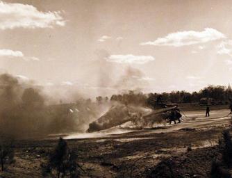 | Keywords: outdoor monochrome sky 330-PS-1341 (USN 706235): The U.S. Navy demonstrates fire-fighting. A pumper truck sprays the blazing plane with a sudsy blanket of “foamite” used for smothering gasoline fires. Members of the crash, fire and rescue crew move in with hoses to play suds on “Fire-Eaters” who will rescue the dummy pilot. The rescuers are in the smoke on the wing of the fighter. Photograph released May 15, 1951. (6/16/2015). 330-PS-1341 (USN 706235): The U.S. Navy demonstrates fire-fighting. A pumper truck sprays the blazing plane with a sudsy blanket of “foamite” used for smothering gasoline fires. Members of the crash, fire and rescue crew move in with hoses to play suds on “Fire-Eaters” who will rescue the dummy pilot. The rescuers are in the smoke on the wing of the fighter. Photograph released May 15, 1951. (6/16/2015). |