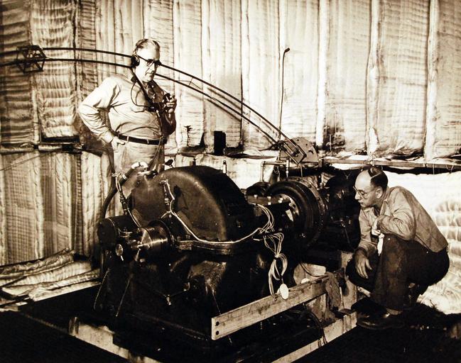 | Keywords: 330-PS-1897 (USN 708245): Navy Develops “Sound Proofest” Rooms. These men have “extra ears” for the listening of sounds from this piece of machinery in one of the testing rooms at the new Naval Acoustical Laboratory at Annapolis, Maryland. On the wall is fiber glass covering of the “accordion” form, the newest design yet achieved in sound-proofing. The achievement in sound detection was made possible by the combination of this entirely new idea in sound-proofing and a unique building design. The building is constructed “inside out,” with the interior suspended from outside structural supports. The principal achievement was the creation of an “accordion” form for absorbing sounds. One of the chief elements of the form is fiber glass in sheets eight feet wide and of various lengths. This glass “pillow” was wrapped around a collapsible steel framework which when opened, resembles a spring of v-shaped decorations. The interior of the rooms presents a quilt-line appearance. This decoration has given the Navy what is perhaps the most sensitive sound-free room ever built. The new laboratory has three testing rooms, in any one of which it is possible to record virtually the lowest and highest sound frequencies without interference. The Navy’s civilian engineers worked out the plans for the new testing facility and supervised the construction. It is the property of the Navy’s Bureau of Ships. Photograph released May 25, 1951. (6/16/2015). 330-PS-1897 (USN 708245): Navy Develops “Sound Proofest” Rooms. These men have “extra ears” for the listening of sounds from this piece of machinery in one of the testing rooms at the new Naval Acoustical Laboratory at Annapolis, Maryland. On the wall is fiber glass covering of the “accordion” form, the newest design yet achieved in sound-proofing. The achievement in sound detection was made possible by the combination of this entirely new idea in sound-proofing and a unique building design. The building is constructed “inside out,” with the interior suspended from outside structural supports. The principal achievement was the creation of an “accordion” form for absorbing sounds. One of the chief elements of the form is fiber glass in sheets eight feet wide and of various lengths. This glass “pillow” was wrapped around a collapsible steel framework which when opened, resembles a spring of v-shaped decorations. The interior of the rooms presents a quilt-line appearance. This decoration has given the Navy what is perhaps the most sensitive sound-free room ever built. The new laboratory has three testing rooms, in any one of which it is possible to record virtually the lowest and highest sound frequencies without interference. The Navy’s civilian engineers worked out the plans for the new testing facility and supervised the construction. It is the property of the Navy’s Bureau of Ships. Photograph released May 25, 1951. (6/16/2015). |