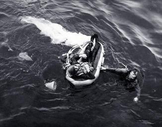 Keywords: outdoor monochrome 330-PS-629 (USN 707938): U.S. Navy pilot rescued two miles off North Korean coast. In making an attack on shipping in North Korea port of Wonsan, Task Force 77 “Corsair” pilot Lieutenant Junior Grade Nathan E. Curry was hit by flak and forced to parachute into the water. A plane in company radioed a patrolling destroyer for help. Two and hone half hours later, the badly burned pilot was picked-up from his one-man raft by the destroyer. During the rescue operation, the destroyer was under threat of an attack by enemy plane, but the plane was driven off by planes of Task Force 77. He was given emergency medical treatment and the next day was transferred back to his carrier. In this photograph, Boiler Technician William A. Vogel tows the one-man raft toward the destroyer side. Note, parachute trailing in water. Injured pilot Curry was unable to remove it. The U.S. Navy ships were not identified. Photograph released August 1950. (7/14/2015). 330-PS-629 (USN 707938): U.S. Navy pilot rescued two miles off North Korean coast. In making an attack on shipping in North Korea port of Wonsan, Task Force 77 “Corsair” pilot Lieutenant Junior Grade Nathan E. Curry was hit by flak and forced to parachute into the water. A plane in company radioed a patrolling destroyer for help. Two and hone half hours later, the badly burned pilot was picked-up from his one-man raft by the destroyer. During the rescue operation, the destroyer was under threat of an attack by enemy plane, but the plane was driven off by planes of Task Force 77. He was given emergency medical treatment and the next day was transferred back to his carrier. In this photograph, Boiler Technician William A. Vogel tows the one-man raft toward the destroyer side. Note, parachute trailing in water. Injured pilot Curry was unable to remove it. The U.S. Navy ships were not identified. Photograph released August 1950. (7/14/2015). |