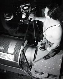 | Keywords: blackandwhite black and white 330-PS-6457-2: Master Caption: U.S. Navy Studies Effects of Vibrations On Man. To study the effects of mechanical vibrations on man, the U.S. Navy has designed and constructed a research instrument termed a large displacement amplitude vibration machine. The Naval Research Laboratory, cooperating with the Naval Medical Research Institute, Bethesda, Maryland, has completed the first phase of the project by the construction, calibration, and testing of the instrument. Over five years in the building, the instrument has now been assembled and installed at the Naval Medical Research Institute where research studies are being undertaken by Lieutenant Commander David E. Goldman, MC, USN, (a Biophysicist). The two-ton instrument was designed to study low frequency vibrations. It is capable of producing smooth vibrations from two to 50 cycles per second. Constructed to handle loads of up to 200 pounds, the table-top vibrating platform moves vertically through a maximum of four inches at accelerations up to 15 units of gravity. Also, special built-in features allow the investigators to vary the cycles per second and the amplitude while the instrument is in operation, or to hold one and vary the other. As machinery with greater power concentrations is developed, the effects of vibration on operators and maintenance crews become more important. Aviators, operators of heavy construction equipment, operators of pneumatic tools, and of small-hand operated rills, buffing tools, etc., often complain of fatigue and discomfort. Occasionally, there is interference with vision and the ability to perform fine handwork. Little is known at this time as to just what effects vibration has on body tissue. Since the body is very complicated mechanical system, the problem is extremely difficult. The investigators in their studies up to this time have found that different parts of the body respond maximally at different speeds. Studies are now underway to map the mechanical structure of the body and its vibratory motion at various settings of the vibration machine. Studies will then be made of physiological and psychological responses. With this information, it will be possible to establish safety and tolerance limits as well as to devise protective measures when indicated. Subject is shown on vibration platform. Photograph released January 19, 1954. (4/14/2015). 330-PS-6457-2: Master Caption: U.S. Navy Studies Effects of Vibrations On Man. To study the effects of mechanical vibrations on man, the U.S. Navy has designed and constructed a research instrument termed a large displacement amplitude vibration machine. The Naval Research Laboratory, cooperating with the Naval Medical Research Institute, Bethesda, Maryland, has completed the first phase of the project by the construction, calibration, and testing of the instrument. Over five years in the building, the instrument has now been assembled and installed at the Naval Medical Research Institute where research studies are being undertaken by Lieutenant Commander David E. Goldman, MC, USN, (a Biophysicist). The two-ton instrument was designed to study low frequency vibrations. It is capable of producing smooth vibrations from two to 50 cycles per second. Constructed to handle loads of up to 200 pounds, the table-top vibrating platform moves vertically through a maximum of four inches at accelerations up to 15 units of gravity. Also, special built-in features allow the investigators to vary the cycles per second and the amplitude while the instrument is in operation, or to hold one and vary the other. As machinery with greater power concentrations is developed, the effects of vibration on operators and maintenance crews become more important. Aviators, operators of heavy construction equipment, operators of pneumatic tools, and of small-hand operated rills, buffing tools, etc., often complain of fatigue and discomfort. Occasionally, there is interference with vision and the ability to perform fine handwork. Little is known at this time as to just what effects vibration has on body tissue. Since the body is very complicated mechanical system, the problem is extremely difficult. The investigators in their studies up to this time have found that different parts of the body respond maximally at different speeds. Studies are now underway to map the mechanical structure of the body and its vibratory motion at various settings of the vibration machine. Studies will then be made of physiological and psychological responses. With this information, it will be possible to establish safety and tolerance limits as well as to devise protective measures when indicated. Subject is shown on vibration platform. Photograph released January 19, 1954. (4/14/2015). |