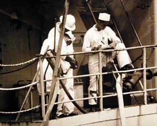 Keywords: 330-PS-6632 (USN 709170a): Tests for radioactivity are made on board the U.S. Navy tanker USS Patapsco, which received slight and not dangerous contamination by radioactive fall-out while operating in support of the task force conducting tests in the Eniwetok-Bikini area. As an extreme precaution, the ship and its crew of six officers and 86 men were brought to Pearl Harbor Naval Shipyard for checking and complete decontamination. None of the personnel received sufficient radiation to be in any way harmful. Although it has been established that no apparent possibility of injury to crew members exists, all members of the crew were removed from the ship and given thorough medical examinations as an extra safety measure. This examination gave no evidence of any harmful effects from the slight exposure. Photograph released April 8, 1954. (4/7/2015). Operation Crossroads. 330-PS-6632 (USN 709170a): Tests for radioactivity are made on board the U.S. Navy tanker USS Patapsco, which received slight and not dangerous contamination by radioactive fall-out while operating in support of the task force conducting tests in the Eniwetok-Bikini area. As an extreme precaution, the ship and its crew of six officers and 86 men were brought to Pearl Harbor Naval Shipyard for checking and complete decontamination. None of the personnel received sufficient radiation to be in any way harmful. Although it has been established that no apparent possibility of injury to crew members exists, all members of the crew were removed from the ship and given thorough medical examinations as an extra safety measure. This examination gave no evidence of any harmful effects from the slight exposure. Photograph released April 8, 1954. (4/7/2015). Operation Crossroads. |