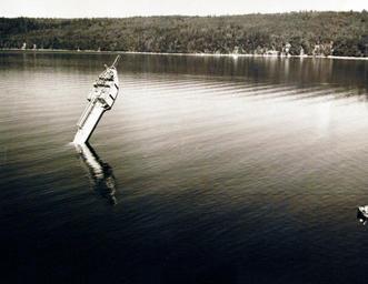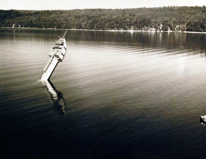 Keywords: outdoor 330-PSA-207-62 (USN 1061430): Floating Instrument Platform (FLIP). FLIP in a stage of flipping. Photograph released August 7, 1962. Master caption: A new type of oceanographic research vessel – Floating Instrument Platform (FLIP) – is undergoing operational tests by the U.S. Navy in Dabob Bay, near Seattle, Washington. FLIP has been constructed for the Marine Physical Laboratory of Scrupps Institution of Oceanography under contract to the Office of Naval Research. The craft can literally flip from a horizontal to a vertical position while at sea. FLIP is flipped into the vertical position by flooding its long aft section with sea water. Only its “four story” bow section remains above the water. To return the vessel to a horizontal position, high pressure air blows the water out of the submerged section. FLIP will be used for studies of wave motion, marine biology, internal waves, sound waves, and other phenomena. The vessel has accommodation for four people and can carry enough supplies to last for about two weeks. In the vertical position, the research laboratories, living quarters, and engine room are above the water. Two diesel engines supply electrical power for air conditioning and other miscellaneous electrical equipment. Two waterfront tubes permit the crew to descent to 150 feet below the water. Upon completion of the tests in Dabob Bay, FLIP will be towed to San Diego, California, to begin its sea voyages. (10/6/2015). 330-PSA-207-62 (USN 1061430): Floating Instrument Platform (FLIP). FLIP in a stage of flipping. Photograph released August 7, 1962. Master caption: A new type of oceanographic research vessel – Floating Instrument Platform (FLIP) – is undergoing operational tests by the U.S. Navy in Dabob Bay, near Seattle, Washington. FLIP has been constructed for the Marine Physical Laboratory of Scrupps Institution of Oceanography under contract to the Office of Naval Research. The craft can literally flip from a horizontal to a vertical position while at sea. FLIP is flipped into the vertical position by flooding its long aft section with sea water. Only its “four story” bow section remains above the water. To return the vessel to a horizontal position, high pressure air blows the water out of the submerged section. FLIP will be used for studies of wave motion, marine biology, internal waves, sound waves, and other phenomena. The vessel has accommodation for four people and can carry enough supplies to last for about two weeks. In the vertical position, the research laboratories, living quarters, and engine room are above the water. Two diesel engines supply electrical power for air conditioning and other miscellaneous electrical equipment. Two waterfront tubes permit the crew to descent to 150 feet below the water. Upon completion of the tests in Dabob Bay, FLIP will be towed to San Diego, California, to begin its sea voyages. (10/6/2015).