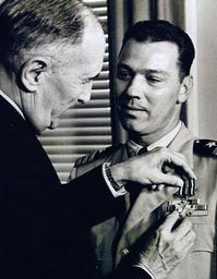 Keywords: people indoor 330-PSA-230-60 (USN 710806): Speed Record Breaking Navy Pilot Receives Distinguished Flying Cross. Secretary of the Navy William B. Franke pins the Distinguished Flying Cross on Commander John F. Davis, USN, during a brief ceremony in the Pentagon, October 4, 1960. Commander Davis succeeded in establishing a world aircraft speed record, pending certification by the Federation Aeronautique Internationale, which betters a Russian claim for the same record made three months ago. The Navy’s record flight was made on September 25 in a McDonnell F4H-1 Phantom II fighter averaging 1390.21 miles an hour over a 100 kilometer closed circuit course 45,000 feet above the Mojave Desert. His plane banked in a near vertical altitude, Commander Davis sped around the exacting 62-mile circular course at Edwards Air Force Base, California, in two minutes, 40.9 seconds. The citation reads in part, “For extraordinary achievement in aerial flight on September 25, 1960, as pilot of a Navy All-Weather Fighter Aircraft, F4H-1, Phantom II, Commander John F. Davis, succeeded in establishing a new world record, and a world class record for class “c” jet aircraft on a 100 kilometer closed course. In the preparation for and execution of this flight, he exercised brilliant airmanship, initiative, foresight and planning ability beyond expectations of normal duty. Through his exceptional feat, he clearly demonstrated the inherent capabilities and the maximum performance of a most important aircraft of the U.S. Navy and focused world attention on the continued significant development of the science of aviation in the U.S. and the superiority of her aircraft and pilots, October 5, 1960. (9/9/2015). 330-PSA-230-60 (USN 710806): Speed Record Breaking Navy Pilot Receives Distinguished Flying Cross. Secretary of the Navy William B. Franke pins the Distinguished Flying Cross on Commander John F. Davis, USN, during a brief ceremony in the Pentagon, October 4, 1960. Commander Davis succeeded in establishing a world aircraft speed record, pending certification by the Federation Aeronautique Internationale, which betters a Russian claim for the same record made three months ago. The Navy’s record flight was made on September 25 in a McDonnell F4H-1 Phantom II fighter averaging 1390.21 miles an hour over a 100 kilometer closed circuit course 45,000 feet above the Mojave Desert. His plane banked in a near vertical altitude, Commander Davis sped around the exacting 62-mile circular course at Edwards Air Force Base, California, in two minutes, 40.9 seconds. The citation reads in part, “For extraordinary achievement in aerial flight on September 25, 1960, as pilot of a Navy All-Weather Fighter Aircraft, F4H-1, Phantom II, Commander John F. Davis, succeeded in establishing a new world record, and a world class record for class “c” jet aircraft on a 100 kilometer closed course. In the preparation for and execution of this flight, he exercised brilliant airmanship, initiative, foresight and planning ability beyond expectations of normal duty. Through his exceptional feat, he clearly demonstrated the inherent capabilities and the maximum performance of a most important aircraft of the U.S. Navy and focused world attention on the continued significant development of the science of aviation in the U.S. and the superiority of her aircraft and pilots, October 5, 1960. (9/9/2015). |