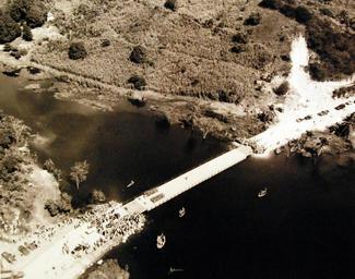 | Keywords: outdoor 330-PSA-293-60 (USN 1051356): Bridge Built by U.S. Navy Seabees dedicated at Lake Miraogoane, Haiti. Aerial view of Dedication Ceremonies at Navy-built bridge, Miragoane, Haiti, November 22, 1960. Master Caption: Representatives of the Government of the United States and Haiti dedicated a U.S. Navy Seabee-built bridge that spans the flooded Lake Miraogoane near Mira, Haiti, November 22, 1960. Among the dignitaries attending were U.S. Ambassador to Haiti and the Haitian Minister of Public Works, Marcel Daumec. Haitian Army engineers called the U.S. for help last summer when an unusual rainfall caused the lake to rise and virtually isolate the southern tip of Haiti. The single highway access to the area was flooded and a result of the western side of the southern peninsula was isolated. A Seabee Detachment from Amphibious Construction Battalion Two (ACB-2), was rushed to the area with supplies to build a pontoon bridge across the flooded sections and improve six miles of road in the bridge approaches. The ACB-2 Unit encountered a two-acre floating island of debris blocking access channels to the bridge. The “Can Do” Seabees blasted the “islands” into sections and then used pontoons and propulsion unit to push the debris to the shoreline. Approval and funds for the project were provided by the International Cooperation Administration, though a cooperative arrangement with the Haitian Government, to the U.S. Navy Department. Photograph released December 2, 1960. (9/15/15). 330-PSA-293-60 (USN 1051356): Bridge Built by U.S. Navy Seabees dedicated at Lake Miraogoane, Haiti. Aerial view of Dedication Ceremonies at Navy-built bridge, Miragoane, Haiti, November 22, 1960. Master Caption: Representatives of the Government of the United States and Haiti dedicated a U.S. Navy Seabee-built bridge that spans the flooded Lake Miraogoane near Mira, Haiti, November 22, 1960. Among the dignitaries attending were U.S. Ambassador to Haiti and the Haitian Minister of Public Works, Marcel Daumec. Haitian Army engineers called the U.S. for help last summer when an unusual rainfall caused the lake to rise and virtually isolate the southern tip of Haiti. The single highway access to the area was flooded and a result of the western side of the southern peninsula was isolated. A Seabee Detachment from Amphibious Construction Battalion Two (ACB-2), was rushed to the area with supplies to build a pontoon bridge across the flooded sections and improve six miles of road in the bridge approaches. The ACB-2 Unit encountered a two-acre floating island of debris blocking access channels to the bridge. The “Can Do” Seabees blasted the “islands” into sections and then used pontoons and propulsion unit to push the debris to the shoreline. Approval and funds for the project were provided by the International Cooperation Administration, though a cooperative arrangement with the Haitian Government, to the U.S. Navy Department. Photograph released December 2, 1960. (9/15/15). |