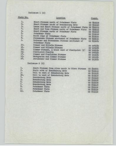 Keywords: 36093 Photo Guide 1 - NARA - 6003824.jpg Scope and content General notes 6003824 Local identifier Inclosure 1 U 36093 Photo Gu / MLR Number A-1 3006 Department of Defense Department of the Army U S Army Europe U S Army Berlin Berlin Brigade 12/01/1961 - ca 1992 Most Recent <br/> <br/> Department of Defense Department of the Army U S Army Europe Berlin Command 05/01/1948 - 12/01/1961 Predecessor Archives II Reference Section Military Textual Archives Services Division NWCT2RM National Archives at College Park 8601 Adelphi Road College Park MD 20740-6001 Record group Record Group 549 Records of United States Army Europe 1942 - 1991 Record group ARC 560363 File Unit nbsp;Inclosure 1 U 11/1961 - 11/1961 <br/> <br/> MLR Number A-1 3006 Series ARC 6003823 File unit File unit ARC Variant control numbers Declassification Project Number NND 36093<br/> HMS/MLR Entry Number A1 3006<br/> Search Identifier A City Torn Apart Building of the Berlin Wall<br/> Search Identifier siBerlin61<br/> Search Identifier The Berlin Crisis of 1961 Building the Wall From Vienna to Checkpoint Charlie Other versions NARA-cooperation PD-USGov United States |