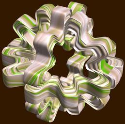 Keywords: mathematica 3d cg parametricplot3d texture torus 輪環 りんかん ドーナツ どーなつ 十芒星 じゅうぼうせい 十光星 じゅうこうせい 十稜星 じゅうりょうせい program プログラム code コード algorithm コード アルゴリズム geometric sculpture geometricsculpture shape geometry sculpture mapping テクスチャ マッピング 模様 もよう design pattern デザイン パターン graphic グラフィック グラフィクス structure 意匠 構造 symmetry 対称性 たいしょうせい シンメトリー 対称 たいしょう algorithm indoor SetOptions[ParametricPlot3D, PlotRange -> Full, Mesh -> None, Boxed -> False, Axes -> None, PlotPoints -> 400, ImageSize -> 3000, Background -> Darker[Orange, 0.8], PlotStyle -> Directive[Specularity[White, 30], Texture[Import["D:/tmp/862.jpg"]]], TextureCoordinateFunction -> ({#4 + #5, #5/Pi} &), Lighting -> "Neutral"]; a = 6; (* center hole size of a torus *) b = 10; (* deca-torus *) c = 0; (* distance from the center of rotation *) d = 3; (* number of torus *) f[v_] := Sin[2 Sin[Sin[Sin[v]]]]; x = (a - Cos[t] - f[b s]) Cos[s + Pi/(2 b)] + c; y = Sum[Sin[(2 k - 1) t]/(2 k - 1), {k, 4}] + c; z = (a - Cos[t] - f[b s]) Sin[s + Pi/(2 b)] + c; rot = Table[{x, y, z}.RotationMatrix[2 i Pi/d, {1, 1, 1}], {i, d}]; ParametricPlot3D[rot, {t, 0, 2 Pi}, {s, 0, 2 Pi}] (*--- The Texture is another color version of this: www.flickr.com/photos/tanaka_juuyoh/5412528282 The y is a 4-partial sum of the Fourier series for Square wave. yは矩形波のフーリエ展開の最初の4項 *) SetOptions[ParametricPlot3D, PlotRange -> Full, Mesh -> None, Boxed -> False, Axes -> None, PlotPoints -> 400, ImageSize -> 3000, Background -> Darker[Orange, 0.8], PlotStyle -> Directive[Specularity[White, 30], Texture[Import["D:/tmp/862.jpg"]]], TextureCoordinateFunction -> ({#4 + #5, #5/Pi} &), Lighting -> "Neutral"]; a = 6; (* center hole size of a torus *) b = 10; (* deca-torus *) c = 0; (* distance from the center of rotation *) d = 3; (* number of torus *) f[v_] := Sin[2 Sin[Sin[Sin[v]]]]; x = (a - Cos[t] - f[b s]) Cos[s + Pi/(2 b)] + c; y = Sum[Sin[(2 k - 1) t]/(2 k - 1), {k, 4}] + c; z = (a - Cos[t] - f[b s]) Sin[s + Pi/(2 b)] + c; rot = Table[{x, y, z}.RotationMatrix[2 i Pi/d, {1, 1, 1}], {i, d}]; ParametricPlot3D[rot, {t, 0, 2 Pi}, {s, 0, 2 Pi}] (*--- The Texture is another color version of this: www.flickr.com/photos/tanaka_juuyoh/5412528282 The y is a 4-partial sum of the Fourier series for Square wave. yは矩形波のフーリエ展開の最初の4項 *) |