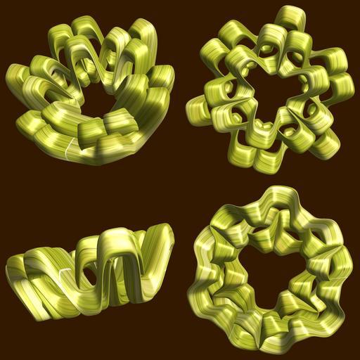 Keywords: mathematica 3d cg parametricplot3d texture torus 輪環 りんかん ドーナツ どーなつ 六芒星 ろくぼうせい 六光星 ろくこうせい 六稜星 ろくりょうせい code program algorithm コード プログラム アルゴリズム hexagram geometric sculpture geometricsculpture shape geometry sculpture mapping テクスチャ マッピング 模様 もよう abstract 抽象 ちゅうしょう アブストラクト design pattern デザイン パターン graphic グラフィック グラフィクス structure 意匠 構造 symmetry 対称性 たいしょうせい シンメトリー 対称 たいしょう algorithm コード indoor black background a = 5; (* center hole size *) b = 6; (* hexa-torus *) c = 1; (* distance from the center of rotation *) d = 3; (* number of torus *) h = 2; (* height of a torus *) SetOptions[ParametricPlot3D, PlotRange -> Full, Mesh -> None, Boxed -> False, Axes -> False, PlotPoints -> 400, ImageSize -> 1600, Background -> Darker[Orange, 0.8], PlotStyle -> Directive[Specularity[White, 30], Texture[Import["D:/tmp/71.jpg"]]], TextureCoordinateFunction -> ({#4 + #5, #5 / Pi} &), Lighting -> "Neutral"]; f[v_] := Sin[2 Sin[Sin[Sin[v]]]]; x = (a - Cos[t] - f[b s]) Cos[s] + c; y = (a - Cos[t] - f[b s]) Sin[s] + c; z = (a - f[t] - h f[b s]); rot = Table[{x, y, z}.RotationMatrix[2 i Pi/d, {0, 0, 1}], {i, d}]; ParametricPlot3D[rot, {t, 0, 2 Pi}, {s, 0, 2 Pi}] (*--- The Texture is this: www.flickr.com/photos/tanaka_juuyoh/5239255695/ *) a = 5; (* center hole size *) b = 6; (* hexa-torus *) c = 1; (* distance from the center of rotation *) d = 3; (* number of torus *) h = 2; (* height of a torus *) SetOptions[ParametricPlot3D, PlotRange -> Full, Mesh -> None, Boxed -> False, Axes -> False, PlotPoints -> 400, ImageSize -> 1600, Background -> Darker[Orange, 0.8], PlotStyle -> Directive[Specularity[White, 30], Texture[Import["D:/tmp/71.jpg"]]], TextureCoordinateFunction -> ({#4 + #5, #5 / Pi} &), Lighting -> "Neutral"]; f[v_] := Sin[2 Sin[Sin[Sin[v]]]]; x = (a - Cos[t] - f[b s]) Cos[s] + c; y = (a - Cos[t] - f[b s]) Sin[s] + c; z = (a - f[t] - h f[b s]); rot = Table[{x, y, z}.RotationMatrix[2 i Pi/d, {0, 0, 1}], {i, d}]; ParametricPlot3D[rot, {t, 0, 2 Pi}, {s, 0, 2 Pi}] (*--- The Texture is this: www.flickr.com/photos/tanaka_juuyoh/5239255695/ *) |