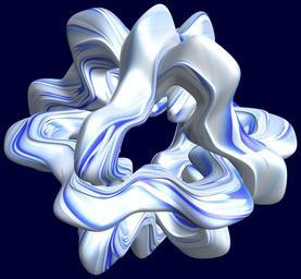 Keywords: parametricplot3d mathematica cg 3d texture torus square wave squarewave 輪環 りんかん ドーナツ どーなつ 六芒星 ろくぼうせい 六光星 ろくこうせい 六稜星 ろくりょうせい program プログラム code コード algorithm コード アルゴリズム hexagram geometric sculpture geometricsculpture shape geometry sculpture mapping テクスチャ マッピング 模様 もよう design pattern デザイン パターン graphic グラフィック グラフィクス structure 意匠 構造 symmetry 対称性 たいしょうせい シンメトリー 対称 たいしょう algorithm indoor black background surreal SetOptions[ParametricPlot3D, PlotRange -> Full, Mesh -> None, Boxed -> False, Axes -> None, PlotPoints -> 400, ImageSize -> 3000, Background -> Darker[Blue, 0.8], PlotStyle -> Directive[Specularity[White, 30], Texture[Import["D:/tmp/863.jpg"]]], TextureCoordinateFunction -> ({#4 + #5, #5/Pi} &), Lighting -> "Neutral"]; a = 5; (* center hole size of a torus *) b = 6; (* hexa-torus *) c = 0; (* distance from the center of rotation *) d = 3; (* number of torus *) f[v_] := Sin[2 Sin[Sin[Sin[v]]]]; g[v_] := Sum[Cos[(2 k - 1) v]/(2 k - 1), {k, 4}]; x = (a - g[t] - f[b s]) Cos[s + Pi/(2 b)] + c; y = f[t] + c; z = (a - g[t] - f[b s]) Sin[s + Pi/(2 b)] + c; rot = Table[{x, y, z}.RotationMatrix[2 i Pi/d, {1, 1, 1}], {i, d}]; ParametricPlot3D[rot, {t, 0, 2 Pi}, {s, 0, 2 Pi}] (*--- The Texture is another color version of this: www.flickr.com/photos/tanaka_juuyoh/5412528282 The g[] is a 4-partial sum of the Fourier series for Square wave. g[]は矩形波のフーリエ展開の最初の4項 *) SetOptions[ParametricPlot3D, PlotRange -> Full, Mesh -> None, Boxed -> False, Axes -> None, PlotPoints -> 400, ImageSize -> 3000, Background -> Darker[Blue, 0.8], PlotStyle -> Directive[Specularity[White, 30], Texture[Import["D:/tmp/863.jpg"]]], TextureCoordinateFunction -> ({#4 + #5, #5/Pi} &), Lighting -> "Neutral"]; a = 5; (* center hole size of a torus *) b = 6; (* hexa-torus *) c = 0; (* distance from the center of rotation *) d = 3; (* number of torus *) f[v_] := Sin[2 Sin[Sin[Sin[v]]]]; g[v_] := Sum[Cos[(2 k - 1) v]/(2 k - 1), {k, 4}]; x = (a - g[t] - f[b s]) Cos[s + Pi/(2 b)] + c; y = f[t] + c; z = (a - g[t] - f[b s]) Sin[s + Pi/(2 b)] + c; rot = Table[{x, y, z}.RotationMatrix[2 i Pi/d, {1, 1, 1}], {i, d}]; ParametricPlot3D[rot, {t, 0, 2 Pi}, {s, 0, 2 Pi}] (*--- The Texture is another color version of this: www.flickr.com/photos/tanaka_juuyoh/5412528282 The g[] is a 4-partial sum of the Fourier series for Square wave. g[]は矩形波のフーリエ展開の最初の4項 *) |