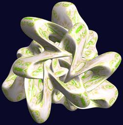 Keywords: mathematica 3d cg parametricplot3d texture torus 輪環 りんかん ドーナツ どーなつ 六芒星 ろくぼうせい 六光星 ろくこうせい 六稜星 ろくりょうせい code program algorithm コード プログラム アルゴリズム hexagram geometric sculpture geometricsculpture shape geometry sculpture mapping テクスチャ マッピング 模様 もよう abstract 抽象 ちゅうしょう アブストラクト design pattern デザイン パターン graphic グラフィック グラフィクス structure 意匠 構造 symmetry 対称性 たいしょうせい シンメトリー 対称 たいしょう algorithm コード black background plant flower organic pattern food blossom a = 2; (* center hole size of a torus *) b = 6; (* hexa-torus *) c = 1; (* distance from the center of rotation *) d = 3; (* number of torus *) h = 0.7; (* height of a torus *) SetOptions[ParametricPlot3D, PlotRange -> Full, Mesh -> None, Boxed -> False, Axes -> False, PlotPoints -> 400, ImageSize -> 3000, Background -> RGBColor[{10, 10, 40}/255], PlotStyle -> Directive[Specularity[White, 30], Texture[Import["D:/tmp/864.jpg"]]], TextureCoordinateFunction -> ({#4, #5 2 Pi} &), Lighting -> "Neutral"]; f[v_] := Sin[2 Sin[Sin[Sin[v]]]]; x = (a - Cos[t] - Sin[b s]) Cos[s + Pi/(2 b)] + c; y = (a - Cos[t] - Sin[b s]) Sin[s + Pi/(2 b)] + c; z = (f[t] - h f[b s]) + c; rot = Table[{x, y, z}.RotationMatrix[2 i Pi/d, {0, 1, 1}], {i, d}]; ParametricPlot3D[rot, {t, 0, 2 Pi}, {s, 0, 2 Pi}] (*--- The Texture *) a = 2; (* center hole size of a torus *) b = 6; (* hexa-torus *) c = 1; (* distance from the center of rotation *) d = 3; (* number of torus *) h = 0.7; (* height of a torus *) SetOptions[ParametricPlot3D, PlotRange -> Full, Mesh -> None, Boxed -> False, Axes -> False, PlotPoints -> 400, ImageSize -> 3000, Background -> RGBColor[{10, 10, 40}/255], PlotStyle -> Directive[Specularity[White, 30], Texture[Import["D:/tmp/864.jpg"]]], TextureCoordinateFunction -> ({#4, #5 2 Pi} &), Lighting -> "Neutral"]; f[v_] := Sin[2 Sin[Sin[Sin[v]]]]; x = (a - Cos[t] - Sin[b s]) Cos[s + Pi/(2 b)] + c; y = (a - Cos[t] - Sin[b s]) Sin[s + Pi/(2 b)] + c; z = (f[t] - h f[b s]) + c; rot = Table[{x, y, z}.RotationMatrix[2 i Pi/d, {0, 1, 1}], {i, d}]; ParametricPlot3D[rot, {t, 0, 2 Pi}, {s, 0, 2 Pi}] (*--- The Texture *) |