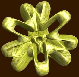 Keywords: mathematica 3d cg parametricplot3d texture torus 輪環 りんかん ドーナツ どーなつ 六芒星 ろくぼうせい 六光星 ろくこうせい 六稜星 ろくりょうせい code program algorithm コード プログラム アルゴリズム hexagram geometric sculpture geometricsculpture shape geometry sculpture mapping テクスチャ マッピング 模様 もよう abstract 抽象 ちゅうしょう アブストラクト design pattern デザイン パターン graphic グラフィック グラフィクス structure 意匠 構造 symmetry 対称性 たいしょうせい シンメトリー 対称 たいしょう algorithm コード black background flower organic pattern plant macro a = 3; (* center hole size of a torus *) b = 6; (* hexa-torus *) c = 1; (* distance from the center of rotation *) d = 3; (* number of torus *) h = 1; (* height of a torus *) SetOptions[ParametricPlot3D, PlotRange -> Full, Mesh -> None, Boxed -> False, Axes -> False, PlotPoints -> 400, ImageSize -> 1600, Background -> Darker[Orange, 0.8], PlotStyle -> Directive[Specularity[White, 30], Texture[Import["D:/tmp/71.jpg"]]], TextureCoordinateFunction -> ({#4 , #5 2 Pi} &), Lighting -> "Neutral"]; f[v_] := Sin[2 Sin[Sin[Sin[v]]]]; x = (a - Cos[t] - f[b s]) Cos[s] + c; y = (a - Cos[t] - f[b s]) Sin[s] + c; z = (a - Sin[t] - h f[b s]); rot = Table[{x, y, z}.RotationMatrix[2 i Pi/d, {1, 1, 1}], {i, d}]; ParametricPlot3D[rot, {t, 0, 2 Pi}, {s, 0, 2 Pi}] (*--- The Texture is this: www.flickr.com/photos/tanaka_juuyoh/5239255695/ *) a = 3; (* center hole size of a torus *) b = 6; (* hexa-torus *) c = 1; (* distance from the center of rotation *) d = 3; (* number of torus *) h = 1; (* height of a torus *) SetOptions[ParametricPlot3D, PlotRange -> Full, Mesh -> None, Boxed -> False, Axes -> False, PlotPoints -> 400, ImageSize -> 1600, Background -> Darker[Orange, 0.8], PlotStyle -> Directive[Specularity[White, 30], Texture[Import["D:/tmp/71.jpg"]]], TextureCoordinateFunction -> ({#4 , #5 2 Pi} &), Lighting -> "Neutral"]; f[v_] := Sin[2 Sin[Sin[Sin[v]]]]; x = (a - Cos[t] - f[b s]) Cos[s] + c; y = (a - Cos[t] - f[b s]) Sin[s] + c; z = (a - Sin[t] - h f[b s]); rot = Table[{x, y, z}.RotationMatrix[2 i Pi/d, {1, 1, 1}], {i, d}]; ParametricPlot3D[rot, {t, 0, 2 Pi}, {s, 0, 2 Pi}] (*--- The Texture is this: www.flickr.com/photos/tanaka_juuyoh/5239255695/ *)