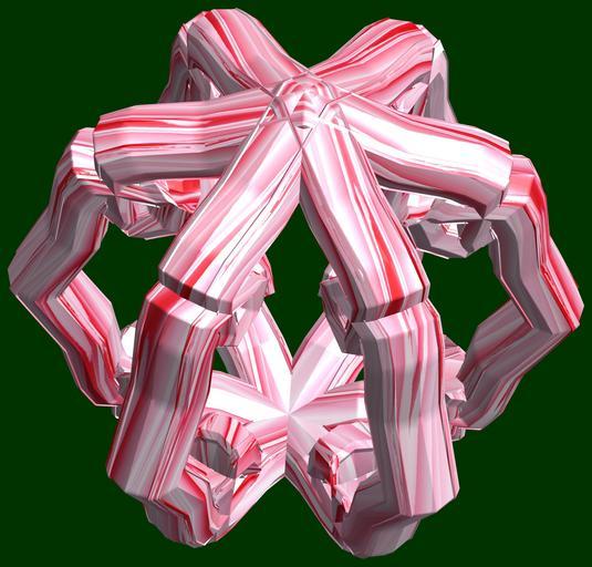 Keywords: mathematica 3d cg parametricplot3d texture torus 輪環 りんかん ドーナツ どーなつ 四芒星 しぼうせい 四光星 しこうせい 四稜星 しりょうせい program プログラム code コード algorithm コード アルゴリズム geometric sculpture geometricsculpture shape geometry sculpture mapping テクスチャ マッピング 模様 もよう design pattern デザイン パターン graphic グラフィック グラフィクス structure 意匠 構造 symmetry 対称性 たいしょうせい シンメトリー 対称 たいしょう algorithm bright pastel SetOptions[ParametricPlot3D, PlotRange -> Full, Mesh -> None, Boxed -> False, Axes -> None, PlotPoints -> 300, ImageSize -> 3000, Background -> Darker[Green, 0.8], PlotStyle -> Directive[Specularity[White, 30], Texture[Import["D:/tmp/86.jpg"]]], TextureCoordinateFunction -> ({#4 + #5, #5/Pi} &), Lighting -> "Neutral"]; a = 6; (* center hole size of a torus *) b = 4; (* tetra-torus *) d = 3; (* number of torus *) f[v_] := Sum[TriangleWave[{-1, 1}, (2 k - 1) v]/(2 k - 1), {k, 3}]; g[v_] := Sum[TriangleWave[{-1, 1}, (2 k - 1) (v + 1/4)]/(2 k - 1), {k, 3}]; x = (a - f[t] - g[b s]) f[s + 1/(2 b)]; y = g[t]; z = (a - f[t] - g[b s]) g[s + 1/(2 b)]; rot = Table[{x, y, z}.RotationMatrix[2 i Pi /d, {1, 0, 0}], {i, d}]; ParametricPlot3D[rot, {t, 0, 1}, {s, 0, 1}] (* --- The Texture *) SetOptions[ParametricPlot3D, PlotRange -> Full, Mesh -> None, Boxed -> False, Axes -> None, PlotPoints -> 300, ImageSize -> 3000, Background -> Darker[Green, 0.8], PlotStyle -> Directive[Specularity[White, 30], Texture[Import["D:/tmp/86.jpg"]]], TextureCoordinateFunction -> ({#4 + #5, #5/Pi} &), Lighting -> "Neutral"]; a = 6; (* center hole size of a torus *) b = 4; (* tetra-torus *) d = 3; (* number of torus *) f[v_] := Sum[TriangleWave[{-1, 1}, (2 k - 1) v]/(2 k - 1), {k, 3}]; g[v_] := Sum[TriangleWave[{-1, 1}, (2 k - 1) (v + 1/4)]/(2 k - 1), {k, 3}]; x = (a - f[t] - g[b s]) f[s + 1/(2 b)]; y = g[t]; z = (a - f[t] - g[b s]) g[s + 1/(2 b)]; rot = Table[{x, y, z}.RotationMatrix[2 i Pi /d, {1, 0, 0}], {i, d}]; ParametricPlot3D[rot, {t, 0, 1}, {s, 0, 1}] (* --- The Texture *) |